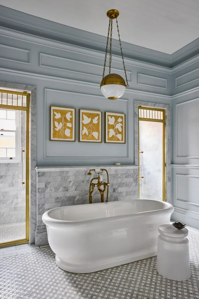 This 1913 Federation home received plenty of love and care thanks to interior designer and homeowner Lauren Mahoney, creative director of Studio Trio. She took inspiration from neoclassical design as well as American interiors. Carrara marble fills the main bathroom, with Daisy floor mosaics from Surface Gallery and bespoke skirting tiles. The Water Monopoly ‘Hanley’ bath pops below panelling in Taubmans Dapple Grey Half.