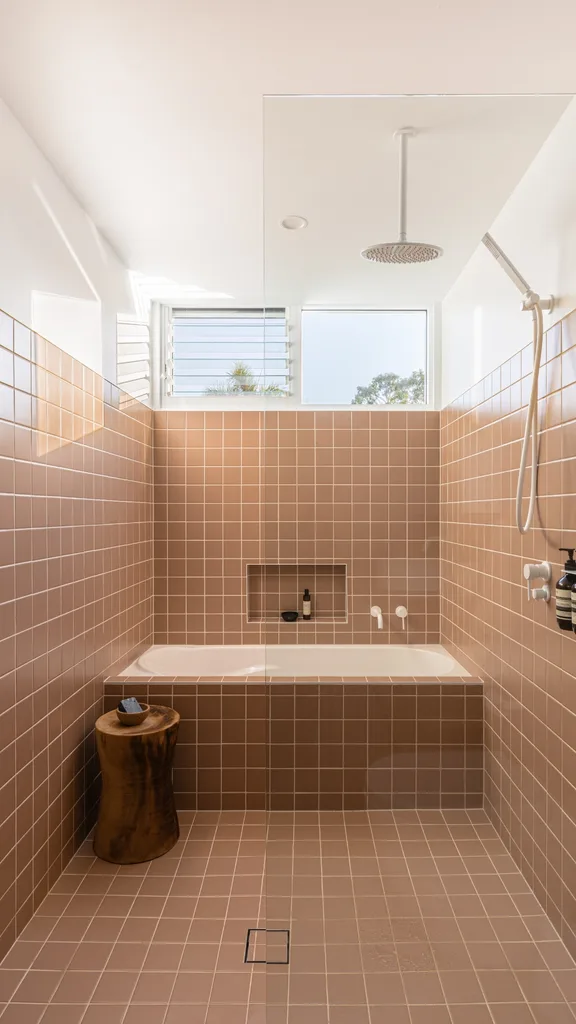 “As tiles are usually on all walls of a bathroom, they’re critical to get right,” says Georgina Twyford, creative director at Studio Yugen. “We only ever select two tiles – one large format for the floors and majority of walls to create a feeling of space, and a feature tile, usually behind the vanity where they won’t get wet.”  This minimises the grout lines in the splash zones, making cleaning easier.