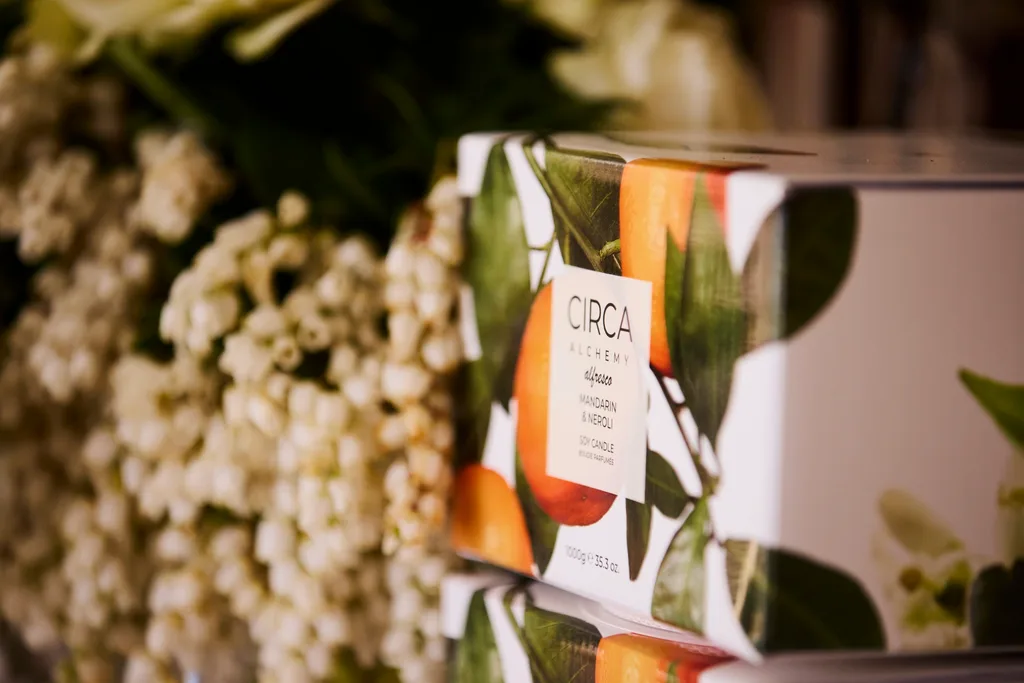 “It’s nice to connect scent to the theme of your gathering,” says Elle. “For example, if you’re serving Italian food, consider lighting a tomato vine candle. If it’s outdoors, you don’t have to go for citronella – candles such as Circa’s ‘Alchemy’ soy outdoor candle in Mandarin and Neroli do double duty to scent the scene and keep mosquitoes at bay, all while looking elegant.
