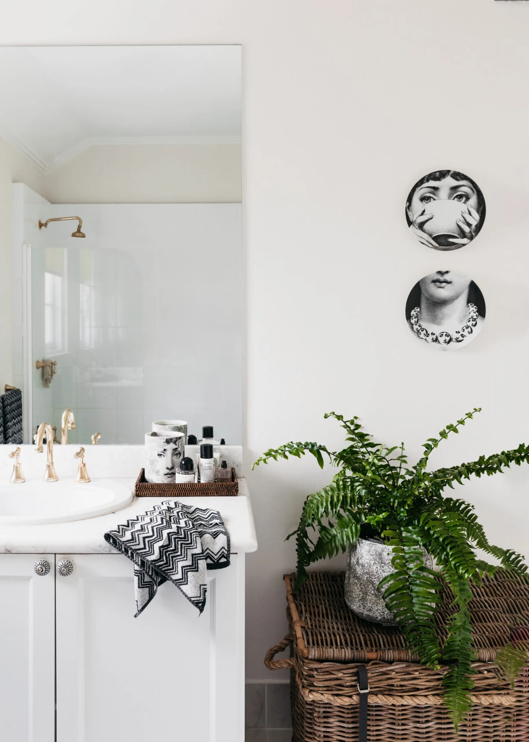 Her childhood armchair was refreshed with Diane Bergeron ‘Park Avenue Petite’ fabric in Moss. The bedhead is in Fabricut ‘Ever Wonder’ textile in Ivy, with cushions in The Textile Company ‘Portofino’ fabric in Lemongrass. Bespoke lamp shades made from Diane Bergeron ‘Ravello’ fabric in Sage/ Olive bookmark the bed. Julie sourced the rattan ‘Cayman’ bedside tables from Florabelle Living. The Susannah Bond landscape hails from Forman Art & Framing. (Credit: Photography: Kate Enno/ Styling: Annalese Hay)Thibaut ‘Taluk’ sisal wallpaper in Blue from Natty & Polly cocoons Amy’s son’s bedroom. Its embossed finish lends a touch-me texture and its vinyl fabrication withstands rambunctious play with ease. The bedhead is upholstered in timeless Warwick Fabrics ‘Calverton R’ stripes in Marine, designed to grow with him through teenage years and beyond. A monkey lamp from The Light Boutique enjoys pride of place on his Ikea ‘Vikhammer’ bedside below a Snoopy print. (Credit: Photography: Kate Enno/ Styling: Annalese Hay)Fornasetti wall plates pep up the bathroom, which is one of just two spaces in Amy’s home where white walls reign. (Credit: Photography: Kate Enno/ Styling: Annalese Hay)