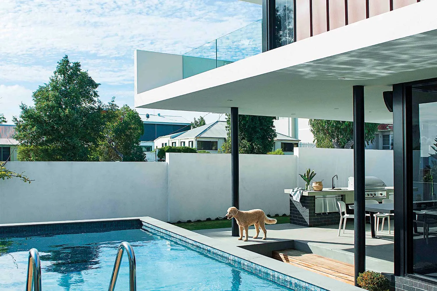 A luxurious lap pool was set above ground, which cleverly alleviated the need to install a pool fence to comply with local building codes. The custom concrete finish is in keeping with the style of the home, as is the warm touch of timber in the Fijian mahogany decking from Austim.