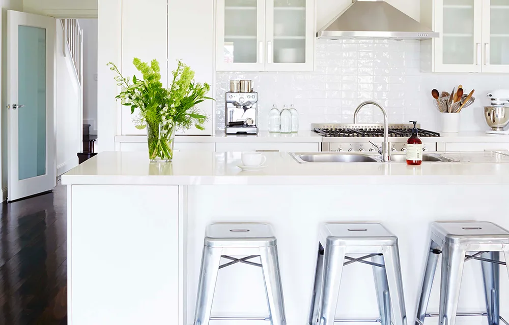 The new kitchen by Adelaide’s Complete Kitchens is a symphony of white textures. Smart Laminex cabinets in Alabaster continue to ceiling height, while handmade splashback tiles from Eco Tile Factory add just the right amount of shine. Try Caesarstone in Snow for a similar glistening benchtop. Glass cupboard fronts, metal Tolix-style stools from Replica Furniture, warm timber floors and conical glass pendants from One World Collection add depth and interest.