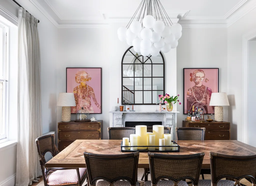 The pinks in the dining and living areas were inspired by Jai Vasicek prints Chelsea found at Fenton & Fenton.