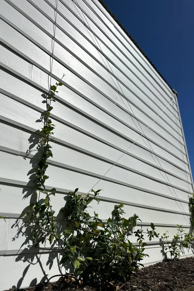 Screw eye straps to the wall approximately 2m apart at the top and bottom of the wall. Ronnie custom-designed his to suit the wall so each square is 2.2m x 2.6m. “The great thing about star jasmine on a trellis is that it’s so flexible,” says Georgia. “You can adjust the size or pattern to suit any wall, big or small and still get the same great, lush result.”