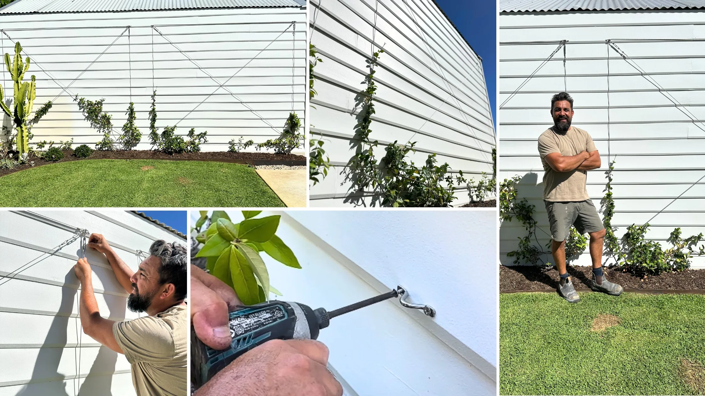 Screw eye straps to the wall approximately 2m apart at the top and bottom of the wall. Ronnie custom-designed his to suit the wall so each square is 2.2m x 2.6m. “The great thing about star jasmine on a trellis is that it’s so flexible,” says Georgia. “You can adjust the size or pattern to suit any wall, big or small and still get the same great, lush result.”