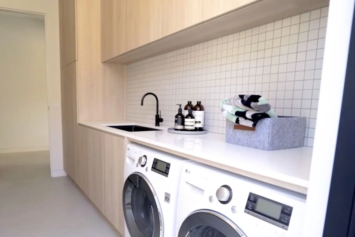 In this episode of House To Home Beautiful, Wendy showcases the smart, simple and stylish design choices of Aimee and Frank’s new laundry. Framed by ample amounts of storage and bench space, the LG washing machine and dryer star in the roomy layout. Finished off with matte black details, this laundry is the perfect practical space for a young family.