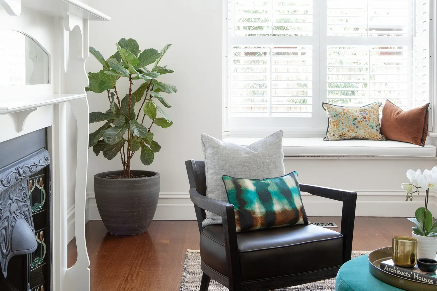 A pair of oversized white plant pots with scalloped edges make a statement in this modern space. (Credit: Photography: Mindi Cooke | Styling; Rachel Honner)